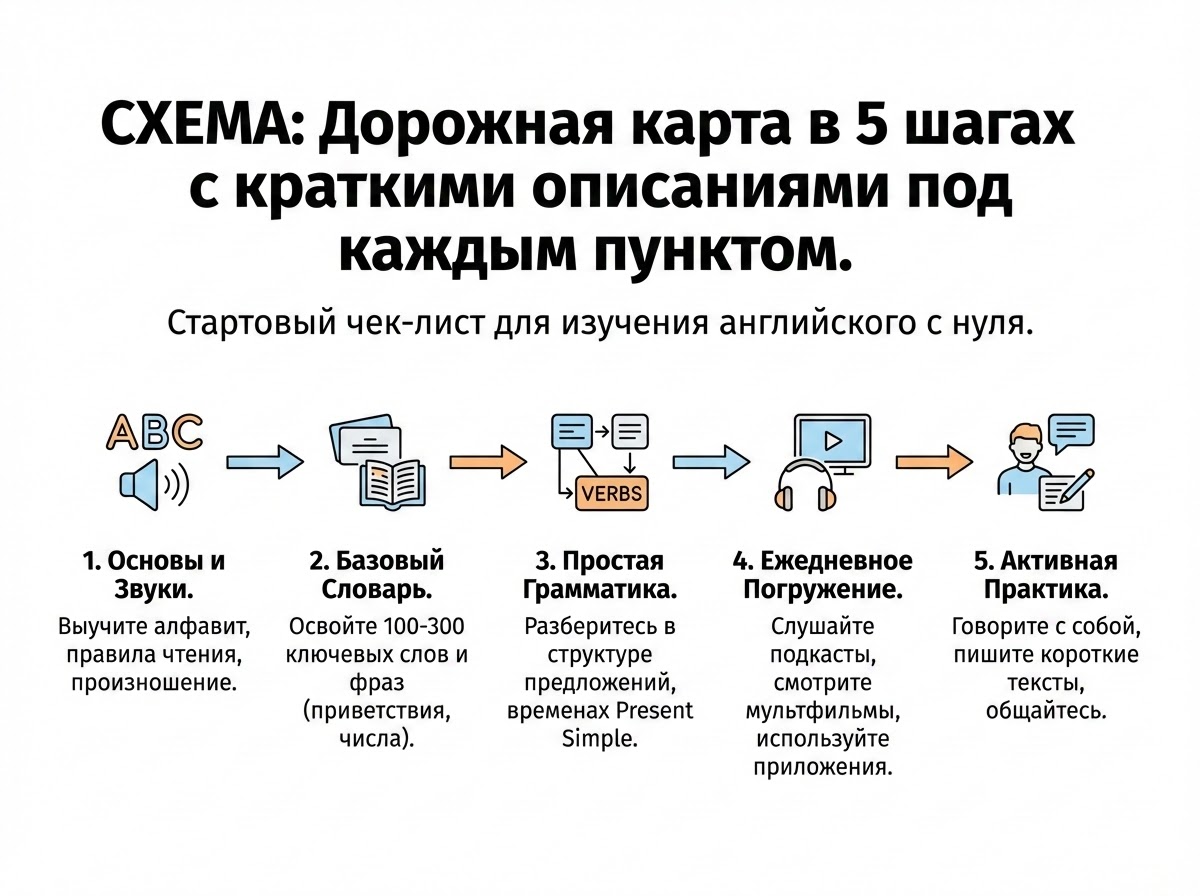 Когда садишься учить английский с нуля, первый вопрос — с чего, чёрт возьми, начать? Вот пять конкретных действий, которые превратят «хочу выучить английский» в реальный старт.
