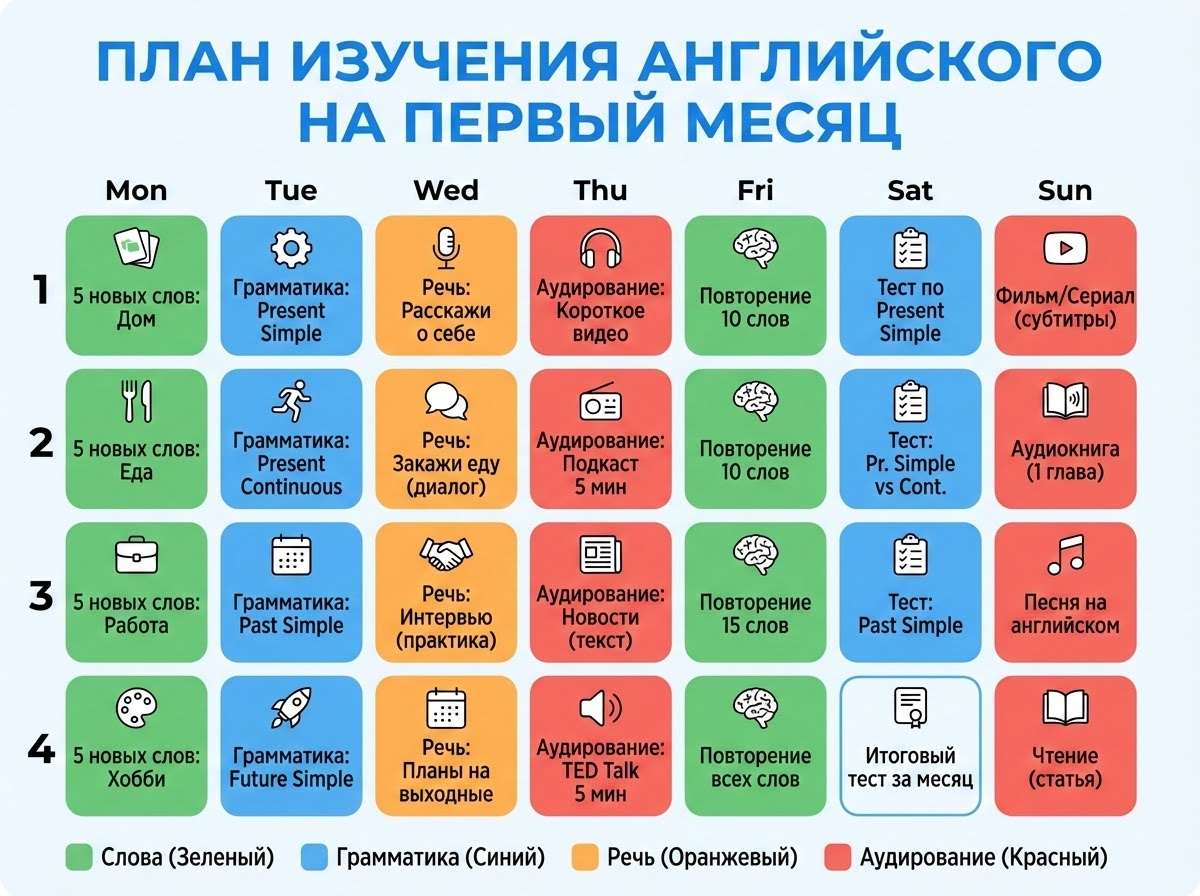 Выходные (Сб–Вс): 60–90 минут (повторение слов, новый юнит учебника, разговорная практика, фильм/подкаст)