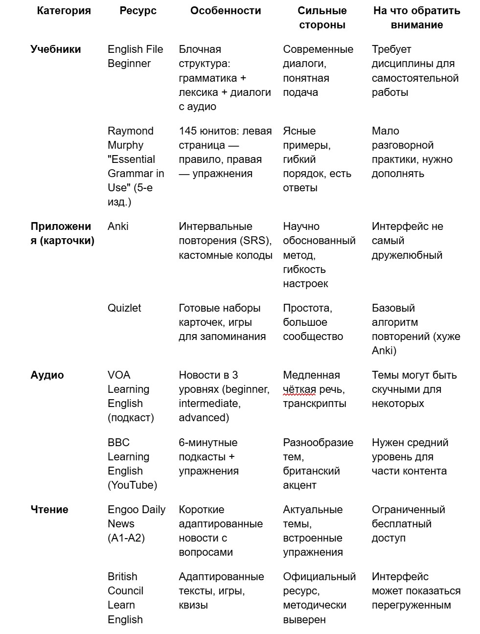 Ключевое правило: выбирайте ресурсы с озвучкой и упражнениями. Пассивное чтение без активной практики даёт минимум пользы.