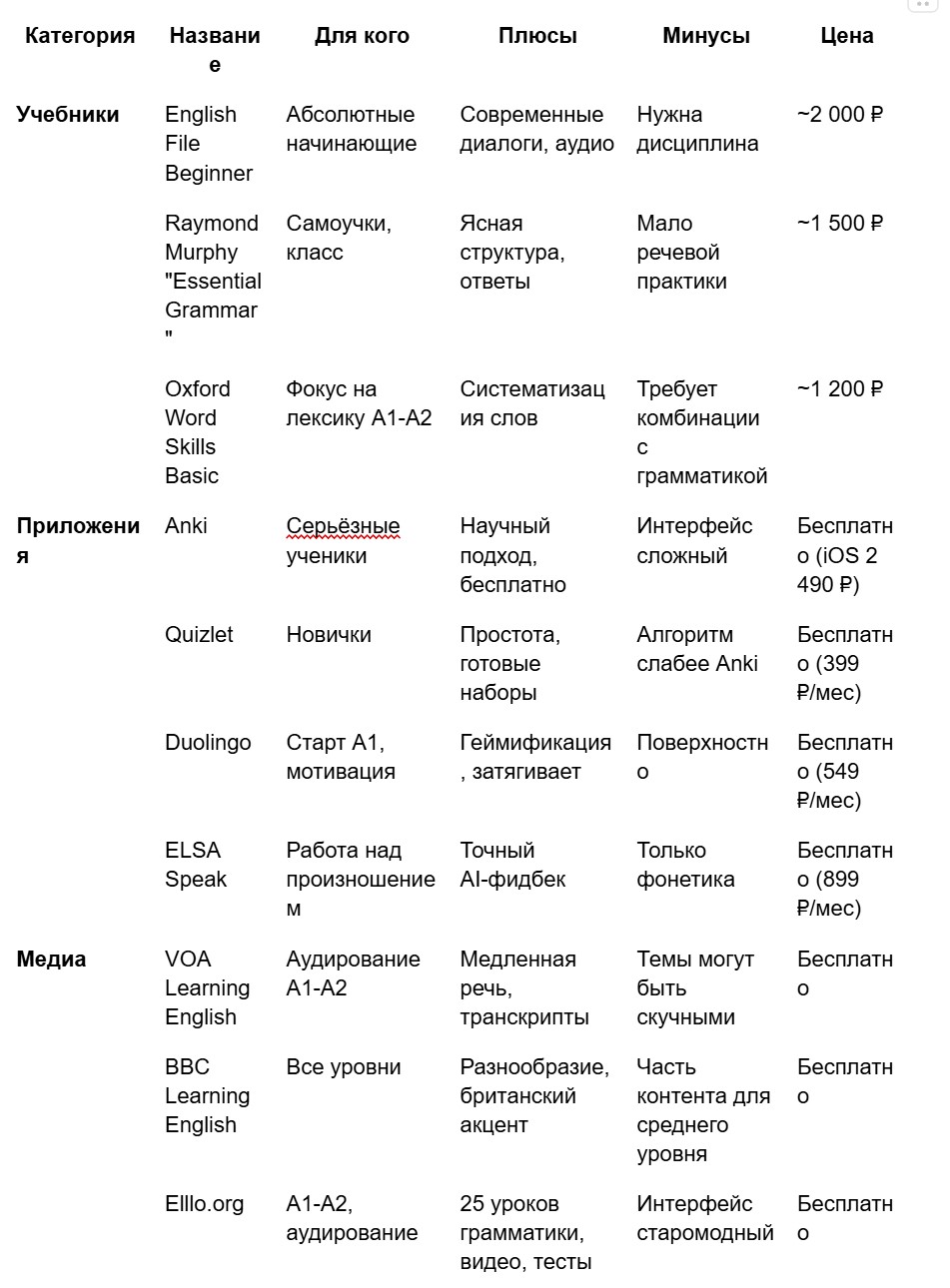 Держите набор стабильным 4–6 недель. Не распыляйтесь. Один учебник + одно приложение + один подкаст — и работайте с ними до конца первого уровня.